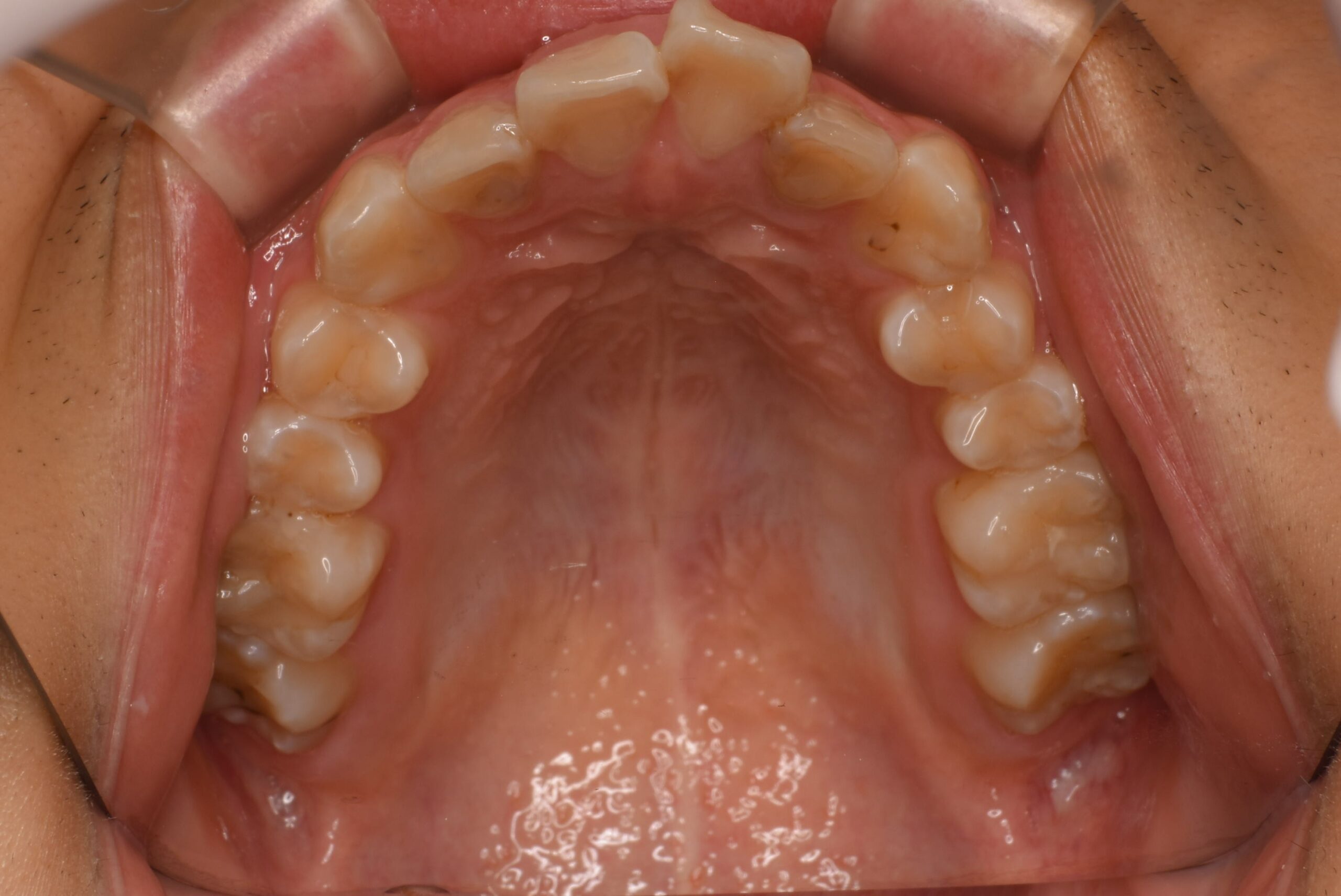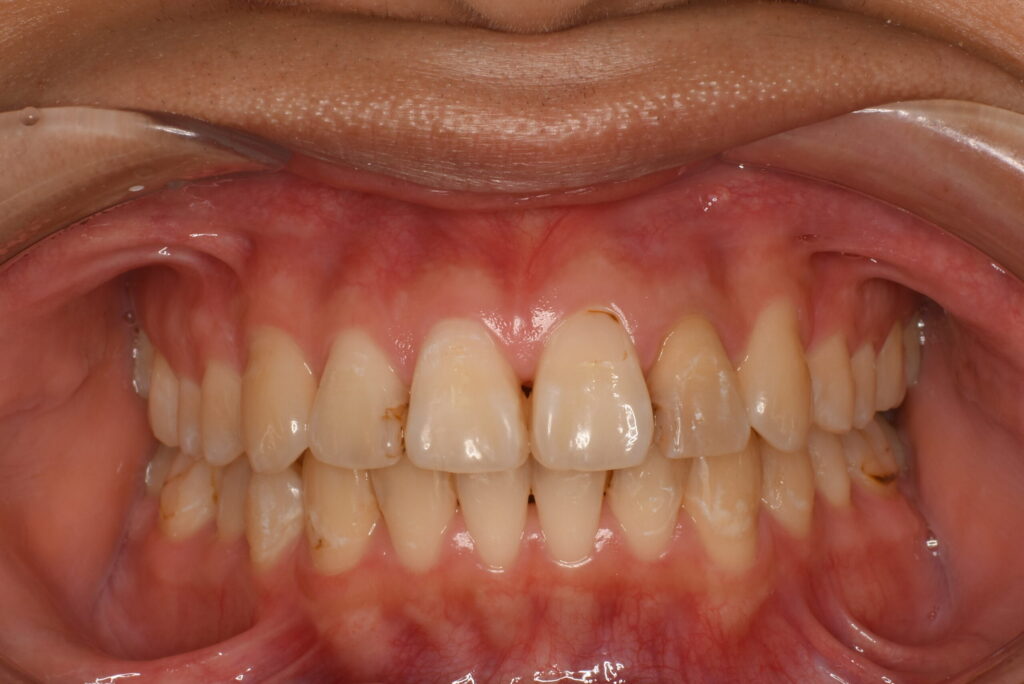| 治療内容 | 患者様は、上の前歯の突出や不揃いな歯並びに加え、咬みにくさや歯のサイズ感にも悩まれており、目立たない方法での矯正治療をご希望され来院された。 診査の結果、前歯部の叢生と上顎前突を認めたが、骨格的には非抜歯での矯正が適応可能と判断した。永久歯列期でのインビザラインによる非抜歯矯正を計画した。 治療は、マウスピース型矯正装置「インビザライン」を使用した。歯の移動スペースを確保するため、必要最小限の歯間削合(歯と歯の間をわずかに削る処置)を行い、歯列全体を整えながら、前歯の位置・傾斜を調整した。 また、診査時に歯の表面に脱灰(初期の虫歯)を認めたため、セルフケア指導などの予防処置も並行して実施。歯列の改善とともに、口腔内の健康維持にも配慮した治療を行った。 |