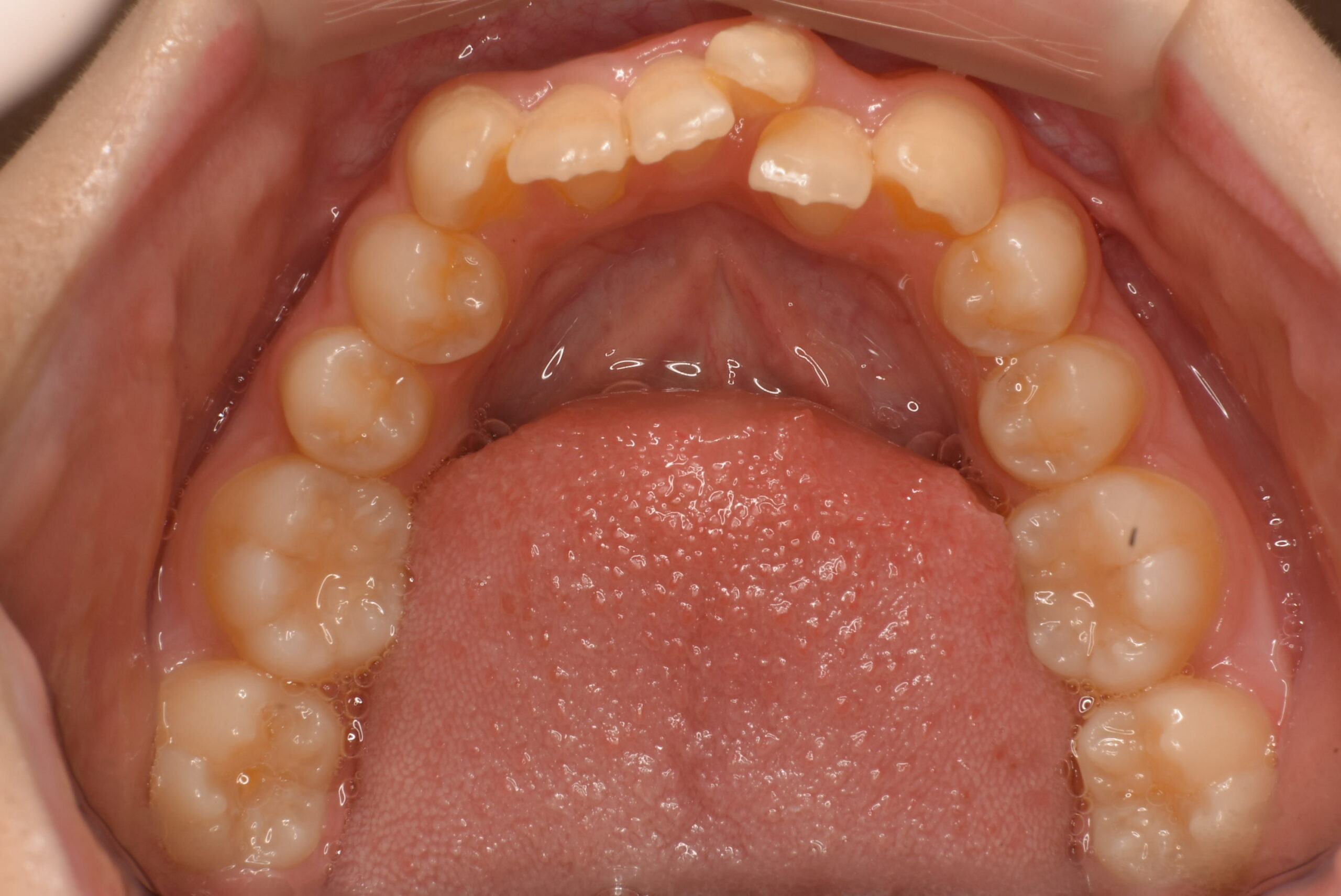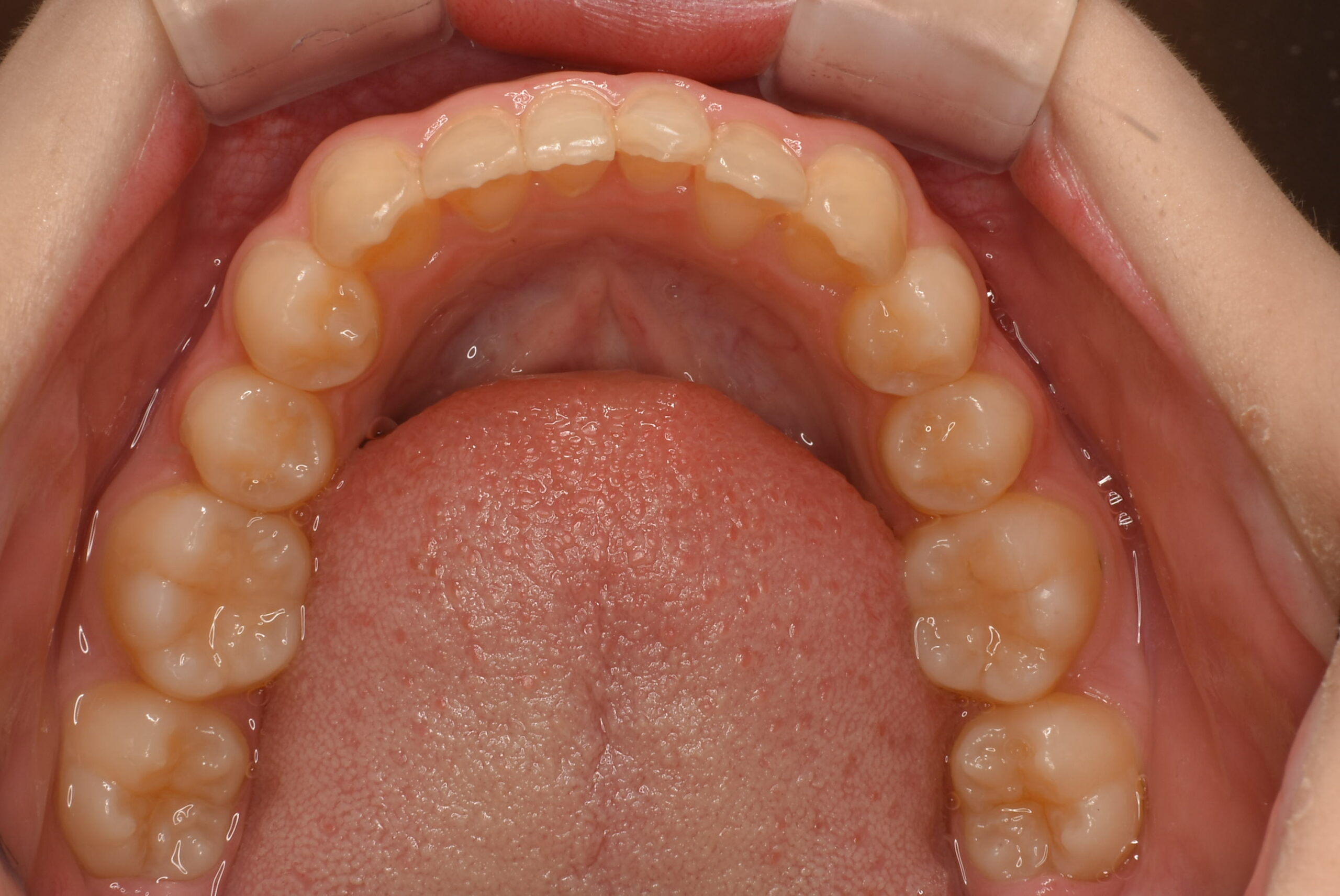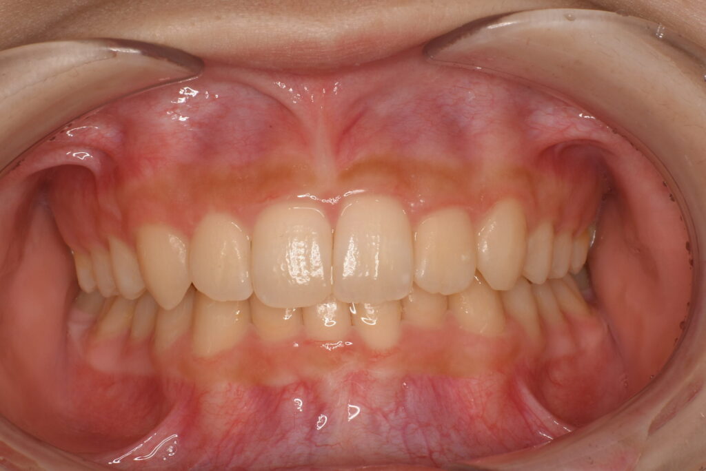 | 治療内容 | 患者様は、下の前歯のガタガタした歯並び(叢生)と、歯と歯の間に食べ物が挟まりやすいこと、汚れがたまりやすいことを主訴として来院されました。 診査の結果、下顎前歯部に叢生を認め、歯間が非常に狭くプラークが停滞しやすい状態であったため、非抜歯でのマウスピース型矯正「インビザライン」による治療を選択しました。 治療では、歯の移動に必要なスペースを確保するために、歯と歯の間をわずかに削る処置(IPR)を最小限で実施。 |