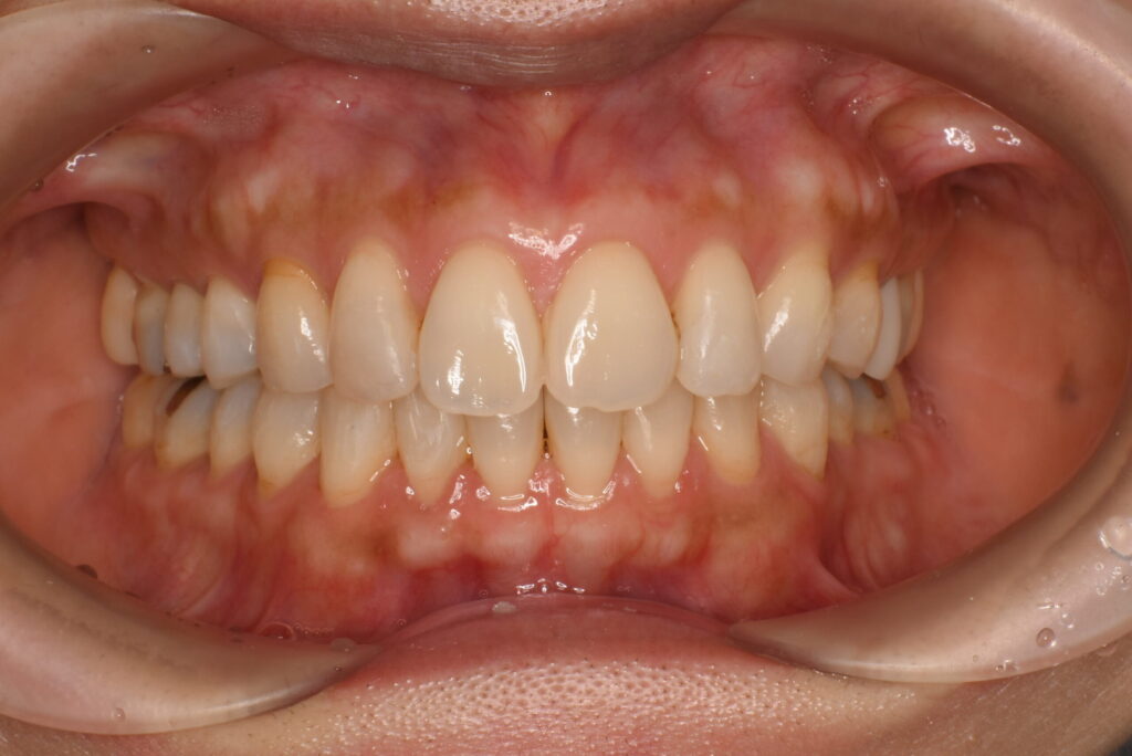 | 治療内容 | 患者様は、上下前歯の前突感(上顎前突)いわゆる口ゴボ、と歯の隙間(空隙歯列)を主訴に来院されました。 目立ちにくい装置での治療を希望され、マウスピース型矯正(インビザライン)を選択されました。 非抜歯で治療を行い、歯と歯の間をわずかに削ってスペースを調整する(IPR)を適宜実施しました。 歯列全体のバランスを整えながら、前歯の突出感と隙間を改善しました。 |