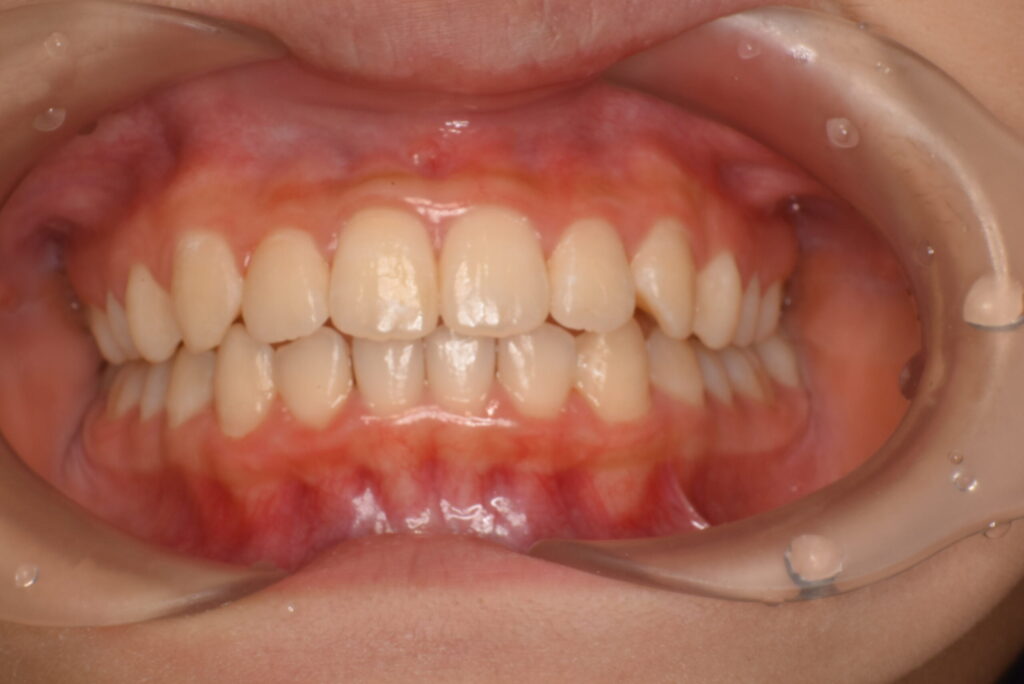 | 治療内容 | 患者様は前歯の突出を気にされて来院されました。マウスピース型矯正(インビザライン)での治療を希望され、診査の結果、非抜歯での矯正治療を計画しました。 初診時はCO(初期むし歯)が多く、C(虫歯)リスクが高めで、プラークコントロール(PC)も良好ではなかったため、まずブラッシング指導から開始しました。 その後、インビザラインによる矯正治療を実施し、IPR(歯と歯の間をわずかに削る処置)を行いながら歯列の整直を図りました。 |