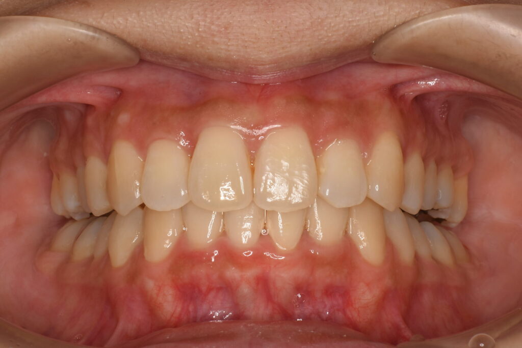 | 治療内容 | 患者様は、上顎前歯の突出や歯列の叢生(ガタつき)、笑った際に歯ぐきが見えすぎること(ガミースマイル)を主訴に来院されました。 診査の結果、抜歯を行うと歯軸の傾斜や歯列の陥没が懸念されたため、非抜歯でのインビザライン治療を計画しました。 |