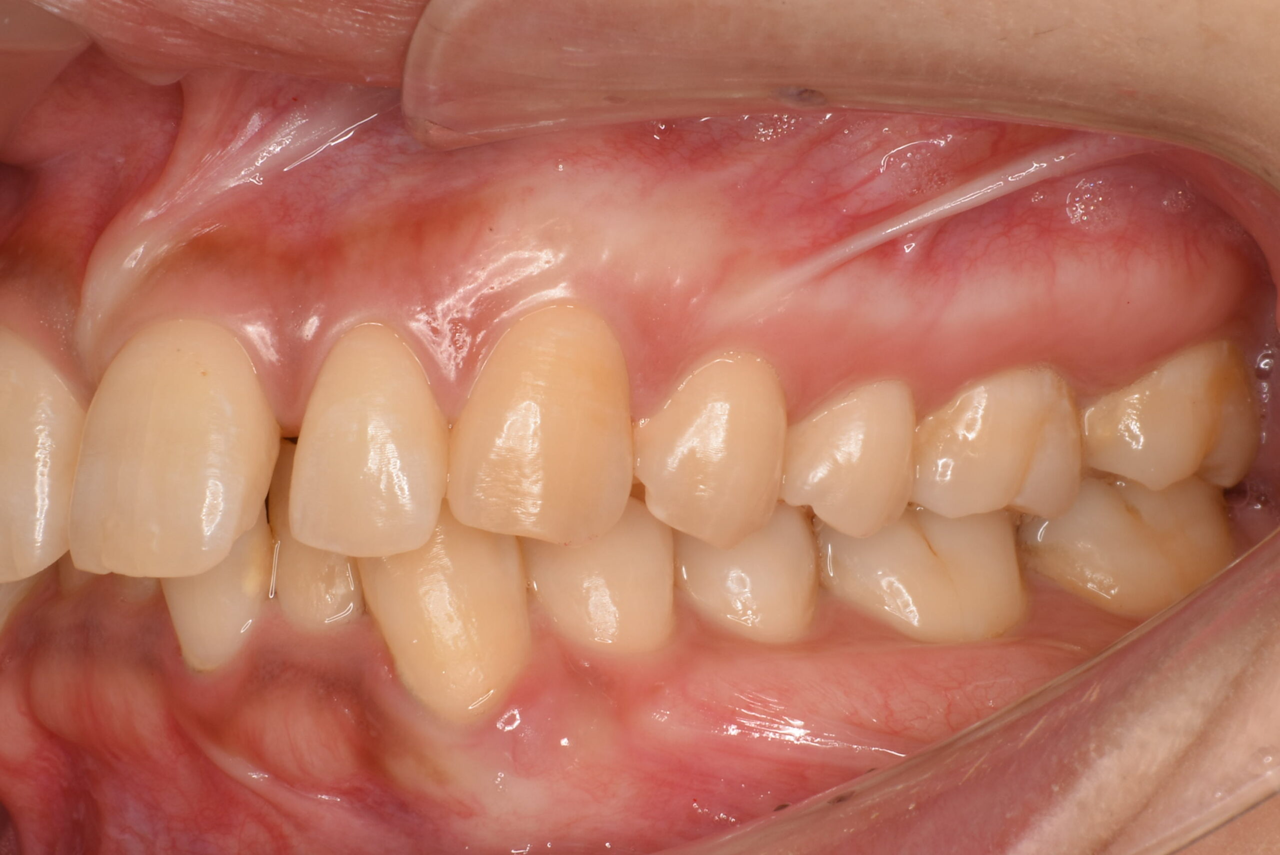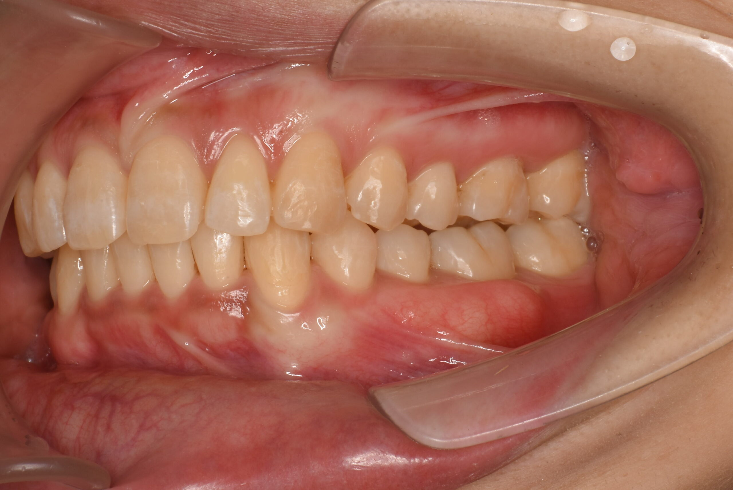 | 治療内容 | 患者様は、上下顎前歯部の叢生(歯のガタつき)や歯間空隙(すきっ歯)、前歯の唇側傾斜(前突/出っ歯)を主訴に来院されました。 診査の結果、抜歯を行わずに歯列全体の配列改善が可能と判断し、マウスピース型矯正装置(インビザライン)による非抜歯矯正を計画しました。 初診時には歯周病の初期症状である、歯肉の炎症および出血傾向が認められたため、矯正治療と並行して歯周治療(プラークコントロール・スケーリング)を実施し、口腔衛生環境の改善にも取り組みました。 |