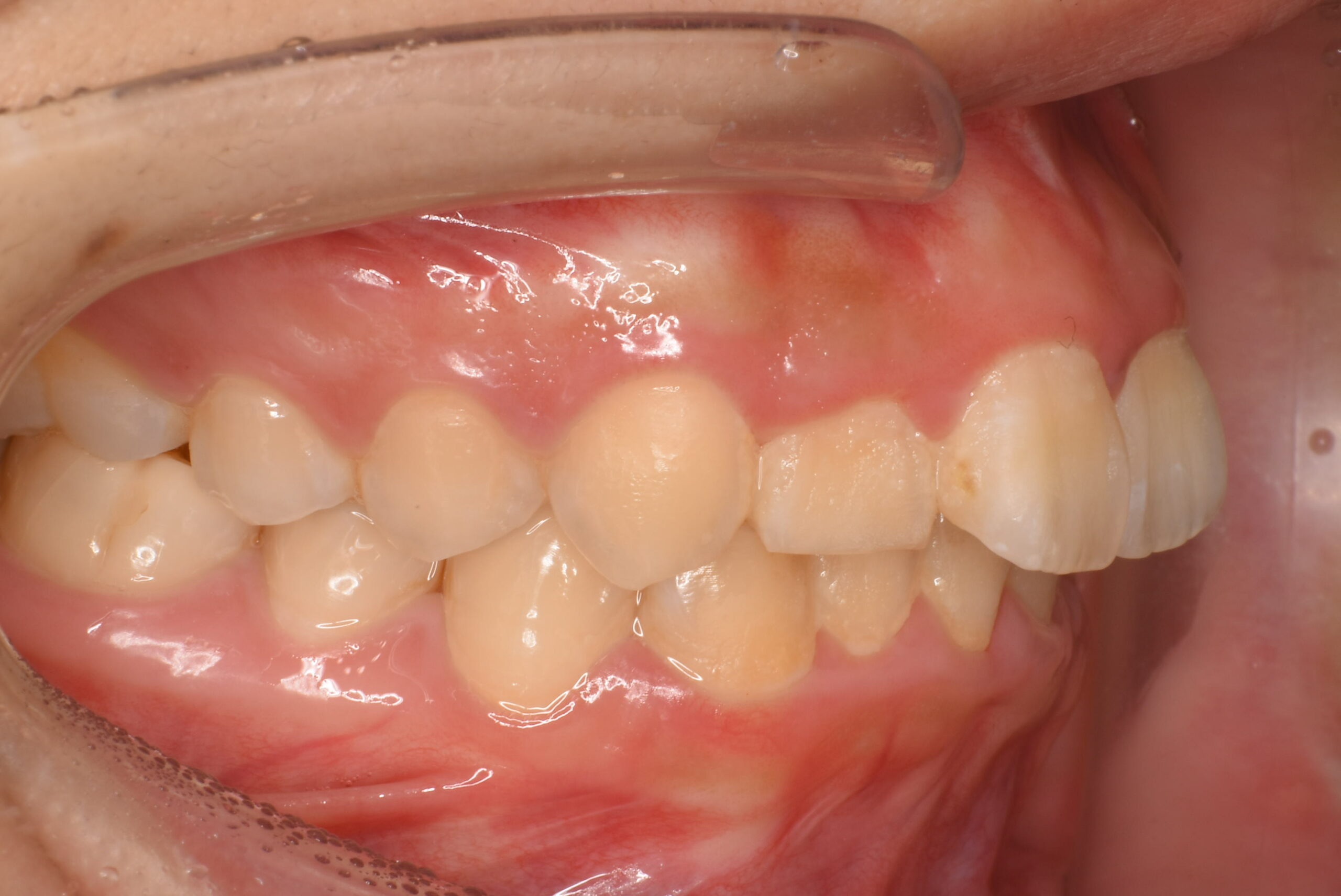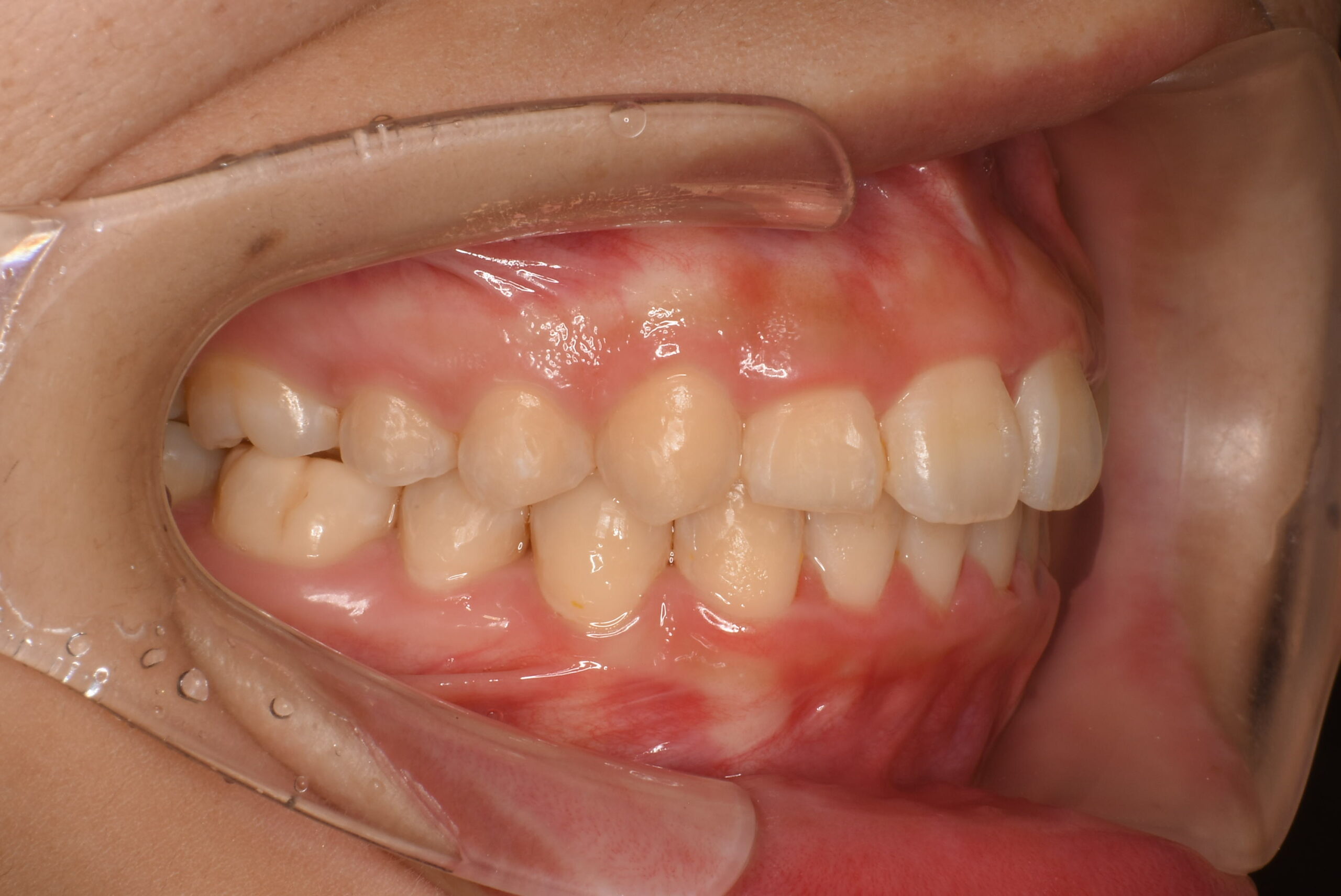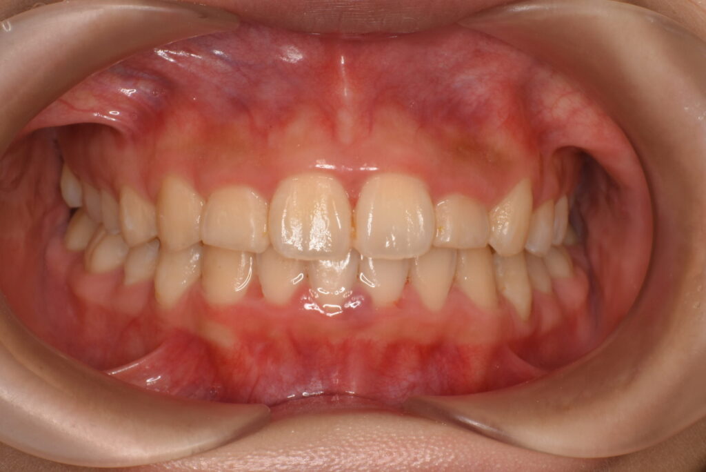 | 治療内容 | 患者様は、上下前歯の叢生(歯のガタつき)やデコボコした不揃いな歯並びに加え、「歯が大きい」「食べ物が挟まりやすい」といった清掃性の低下を主訴に来院されました。また、開口時に顎の痛みがあり、顎関節の違和感も認められました。 非抜歯でのインビザライン治療を計画し、歯列の配列改善を目的に、 |