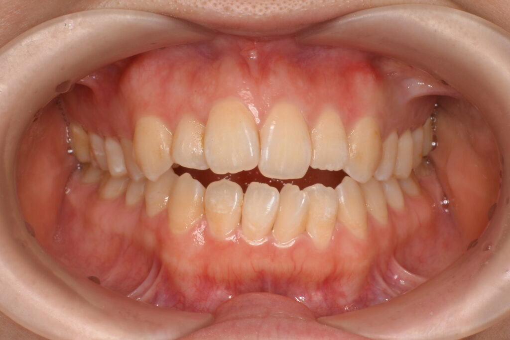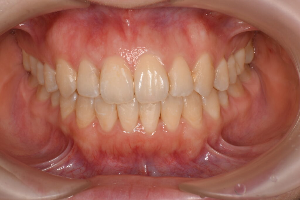 | 治療内容 | 患者様は、上の前歯の突出(上顎前突)と不揃いな歯並び(叢生)を気にされて来院されました。また、歯に汚れがつきやすく磨きにくいこともお悩みでした。抜歯はできるだけ避けたいとのご希望があり、目立ちにくい装置を希望されたため、マウスピース型矯正(インビザライン)を選択しました。歯列全体を整えるにあたり、必要に応じてIPR(歯と歯の間をわずかに削る処置)を行い、スペースを確保して叢生の改善と口元のバランス回復を図りました。 |