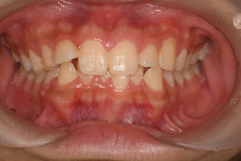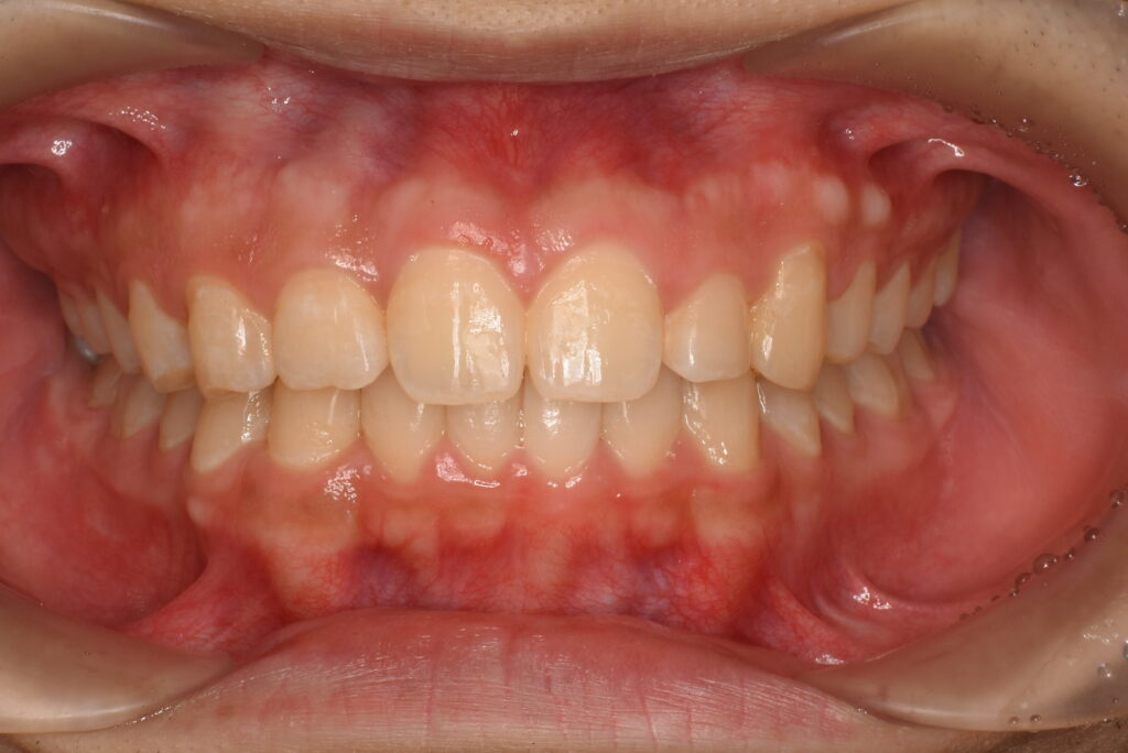 | 治療内容 | 患者様は、歯のガタつき(叢生)、上の前歯の突出(上顎前突)、不揃いな歯並びを気にされて来院されました。また、歯に汚れがつきやすく磨きにくいこともお悩みでした。留学前に矯正治療を終えたいとのご希望があり、最適な治療方法を希望されたため、マウスピース型矯正(インビザライン)を選択しました。歯列全体を整える過程で、IPR(歯と歯の間をわずかに削る処置)を行い、スペースを確保して歯並びの改善を図りました。 |